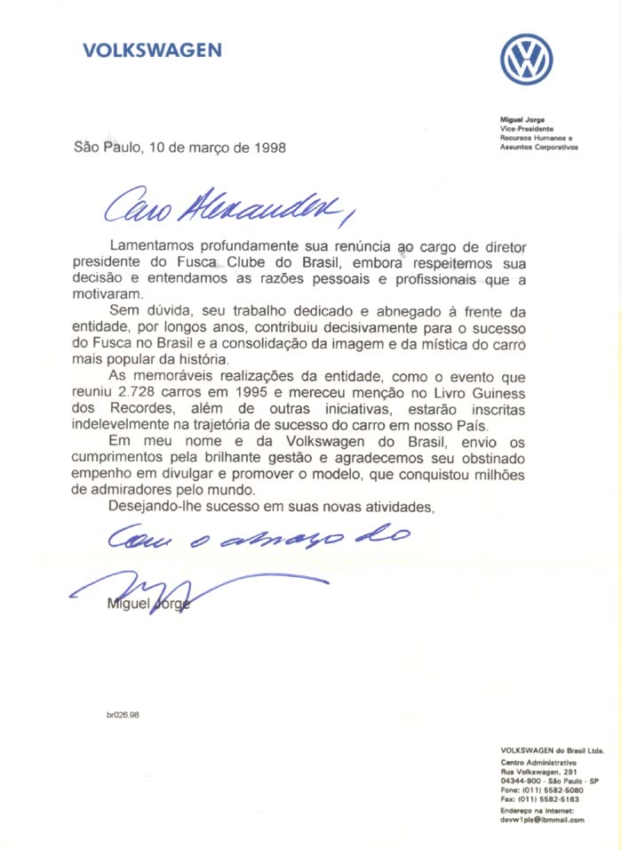 trabalho um bom retorno de imagem para a Volkswagen do Brasil, como atestam as cartas que