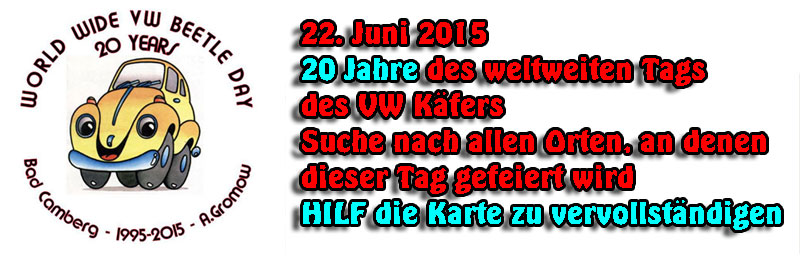 Wir sammeln Daten, um die Feiern des weltweiten Tags des VW Käfers auf einer Karte zu zeigen. Bisher enthält die Karte die Veranstaltungen, die wir bereits bei unserer Recherche zusammengetragen haben. Jetzt bitten wir um Eure Hilfe, um diese Übersicht so gut wie nur möglich zu vervollständigen. Um die vorhandene Karte zu prüfen und weitere Informationen zu bekommen, müsst Ihr die Markierungen anklicken und in die Karte hinein zoomen. Unterhalb der Karte findet Ihr die komplette Liste aller Einträge. Der Link zur Karte: World Wide VW Beetle Day-Examples |