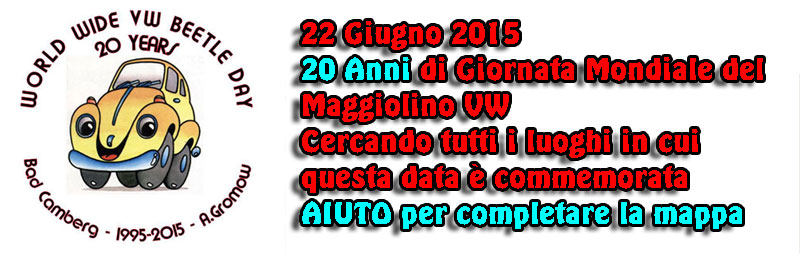 Stiamo raccogliendo dati per elaborare una mappa con le celebrazioni della Giornata Mondiale del Maggiolino VW nel mondo. Per ora questa mappa contiene gli eventi che abbiamo trovato mediante le nostre ricerche, adesso è il momento di chiedere il Vostro aiuto per completare il lavoro nel miglior modo possibile: Per esaminare nel miglio modo la mappa già esistente e avere maggiori informazioni basta cliccare sui marcatori esistenti e usare lo zoom sulla mappa stessa. Sotto la mappa si trova una relazione completa di tutti gli eventi in registro. L'indirizzo della mappa è: World Wide VW Beetle Day-Examples |
