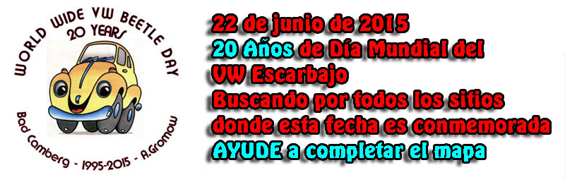 Estamos recogiendo datos para elaborar un mapa con las celebraciones del Día Mundial del VW Escarabajo en el mundo. Por ahora este mapa contiene los eventos que nosotros recogemos por nuestra investigación, ahora es el momento para pedir su ayuda para complementar el trabajo de la mejor manera posible. Para analizar el mapa existente y ver más información haga clic en los marcadores y haga zoom en el mapa. Abajo del mapa se encuentra una relación completa de todos los registros. La dirección del mapa es: World Wide VW Beetle Day-Examples |